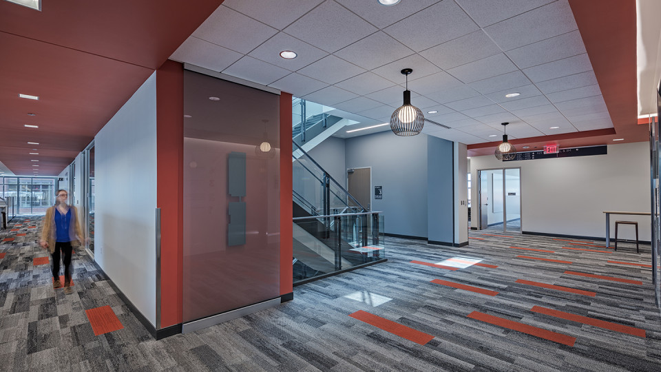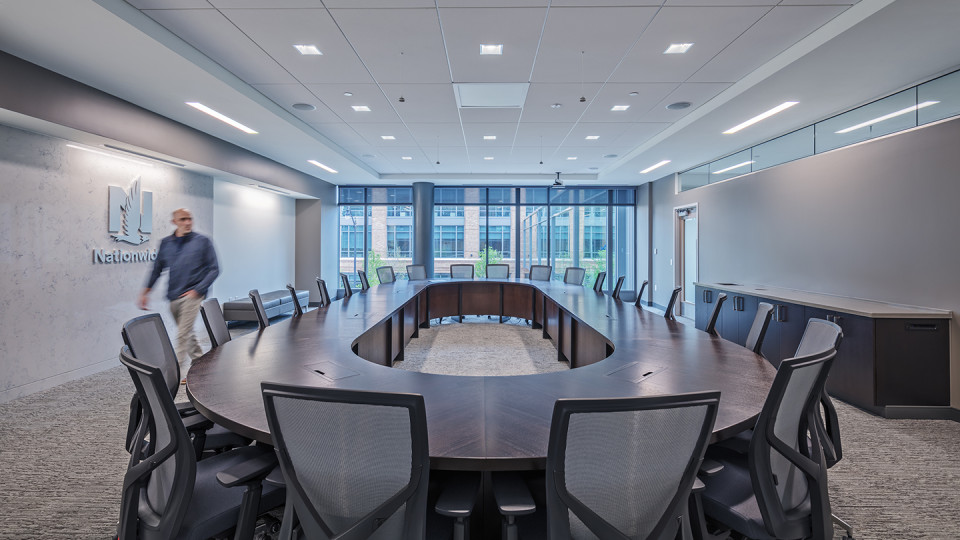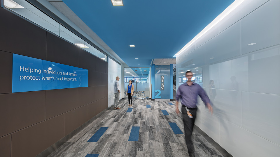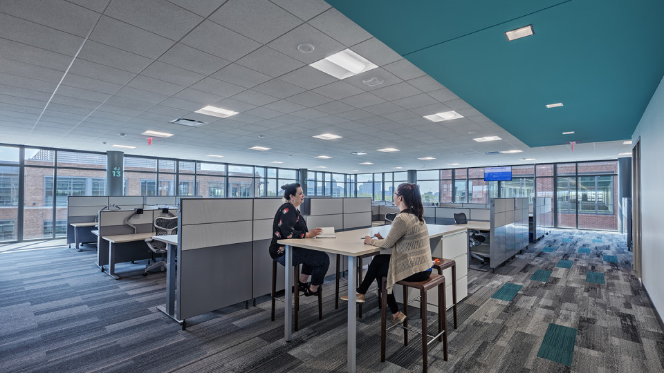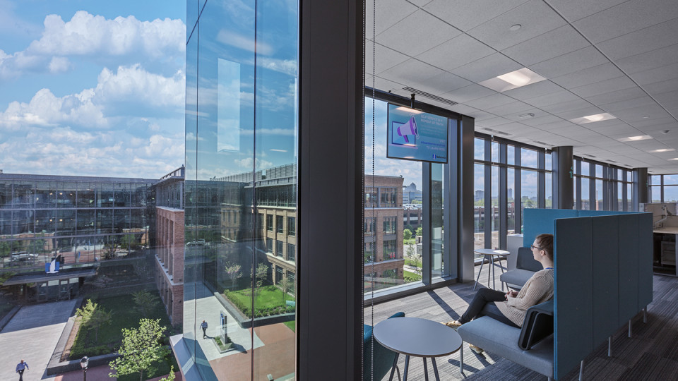 The interior spaces of both buildings are similar. They include a variety of conference spaces for large and small groups, mostly open-office modular furnishings, break rooms with kitchenettes on every floor, several multipurpose/training rooms, and a fitness center.