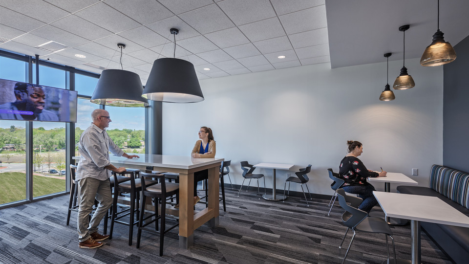 The interior spaces of both buildings are similar. They include a variety of conference spaces for large and small groups, mostly open-office modular furnishings, break rooms with kitchenettes on every floor, several multipurpose/training rooms, and a fitness center.
